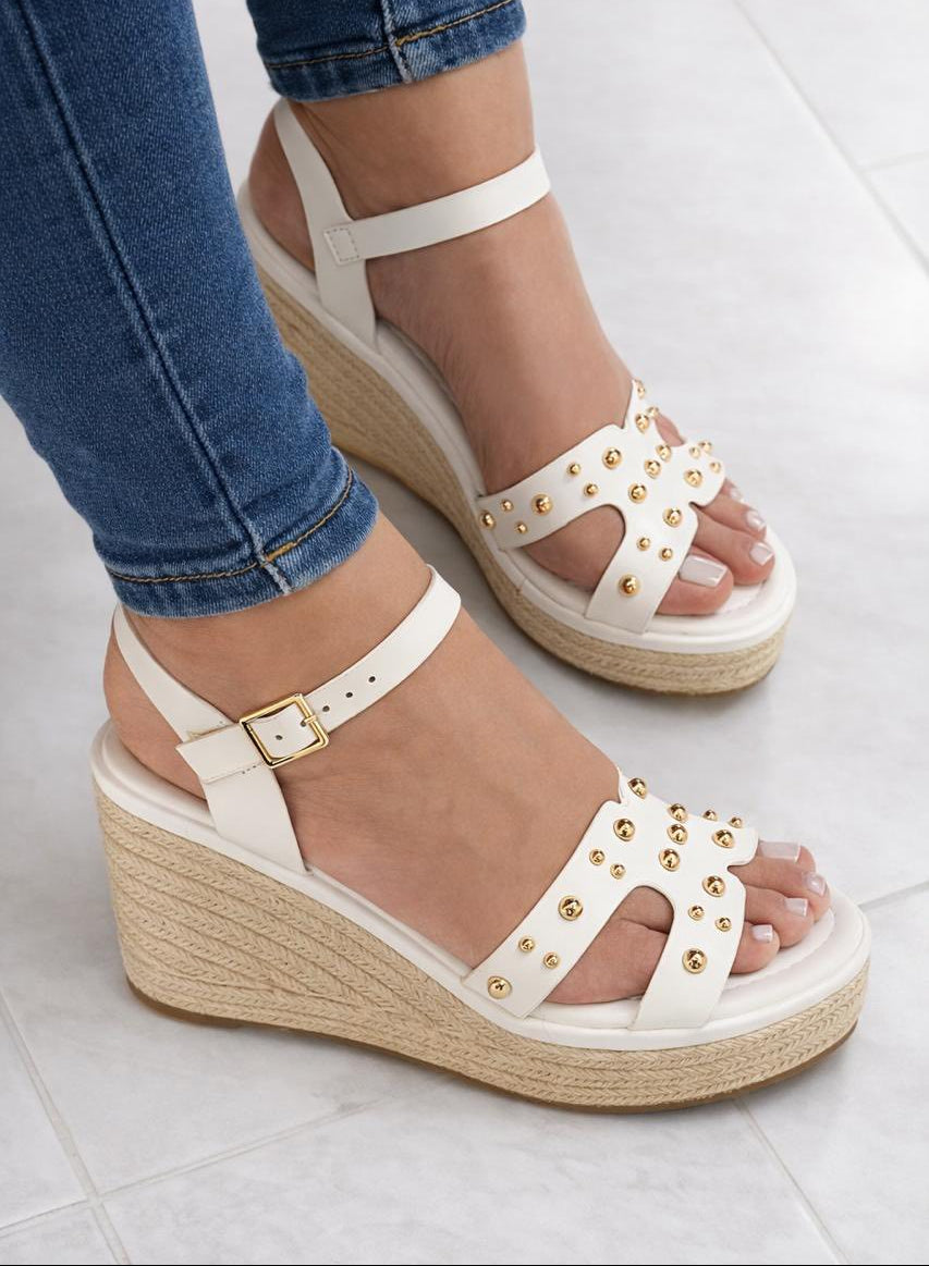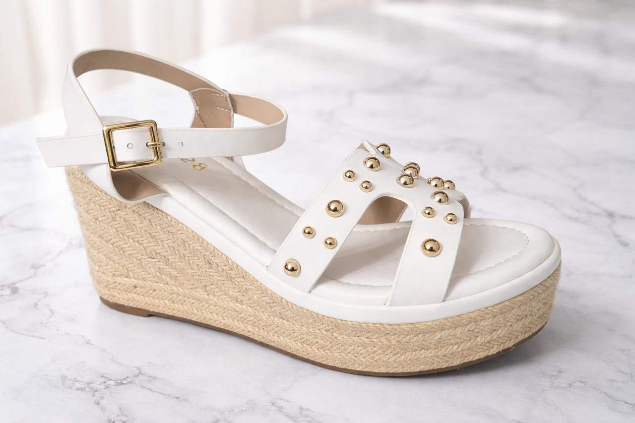 Diseñada con plataforma forrada en yute, correas en tono blanco y detalles metálicos dorados que aportan un toque sofisticado.